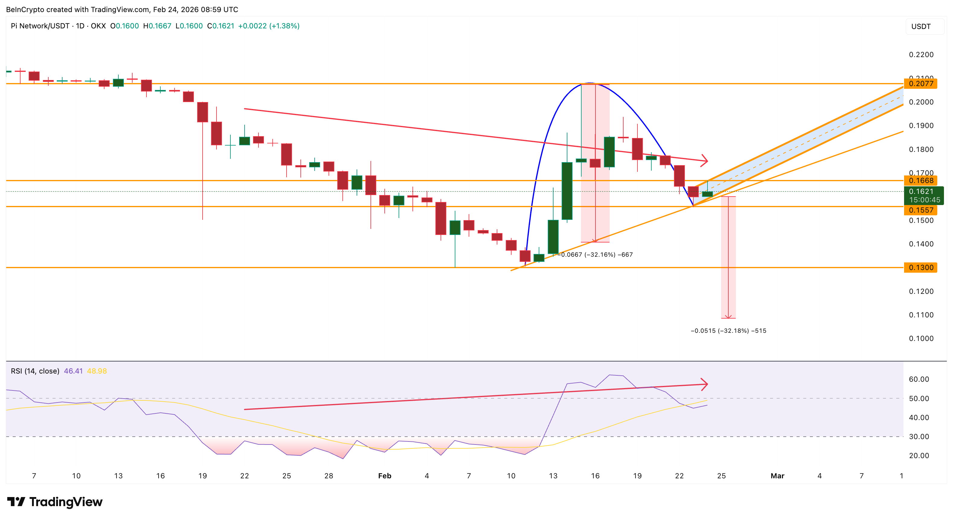 If this bearish pattern confirms, Pi Coin could fall significantly. For immediate confirmation of the divergence, the next price candle must form under $0.166. The breakdown target sits at 32% if the divergence-led pullback breaks the cup’s neckline.