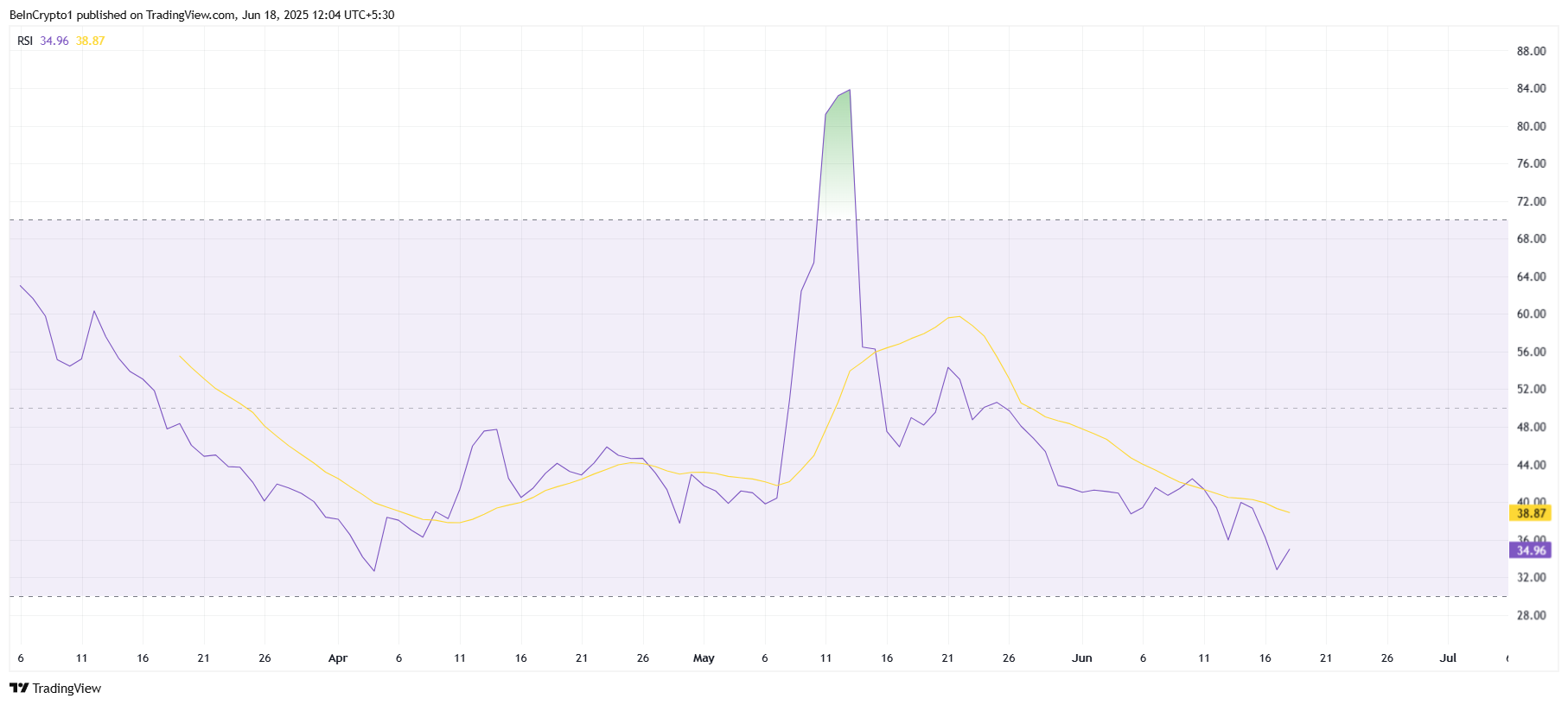 Currently, the Relative Strength Index (RSI) for Pi Network stands at 35, just inches from the oversold threshold of 30.0. This indicates that the cryptocurrency is nearing an oversold condition, which historically signals a potential bounce.