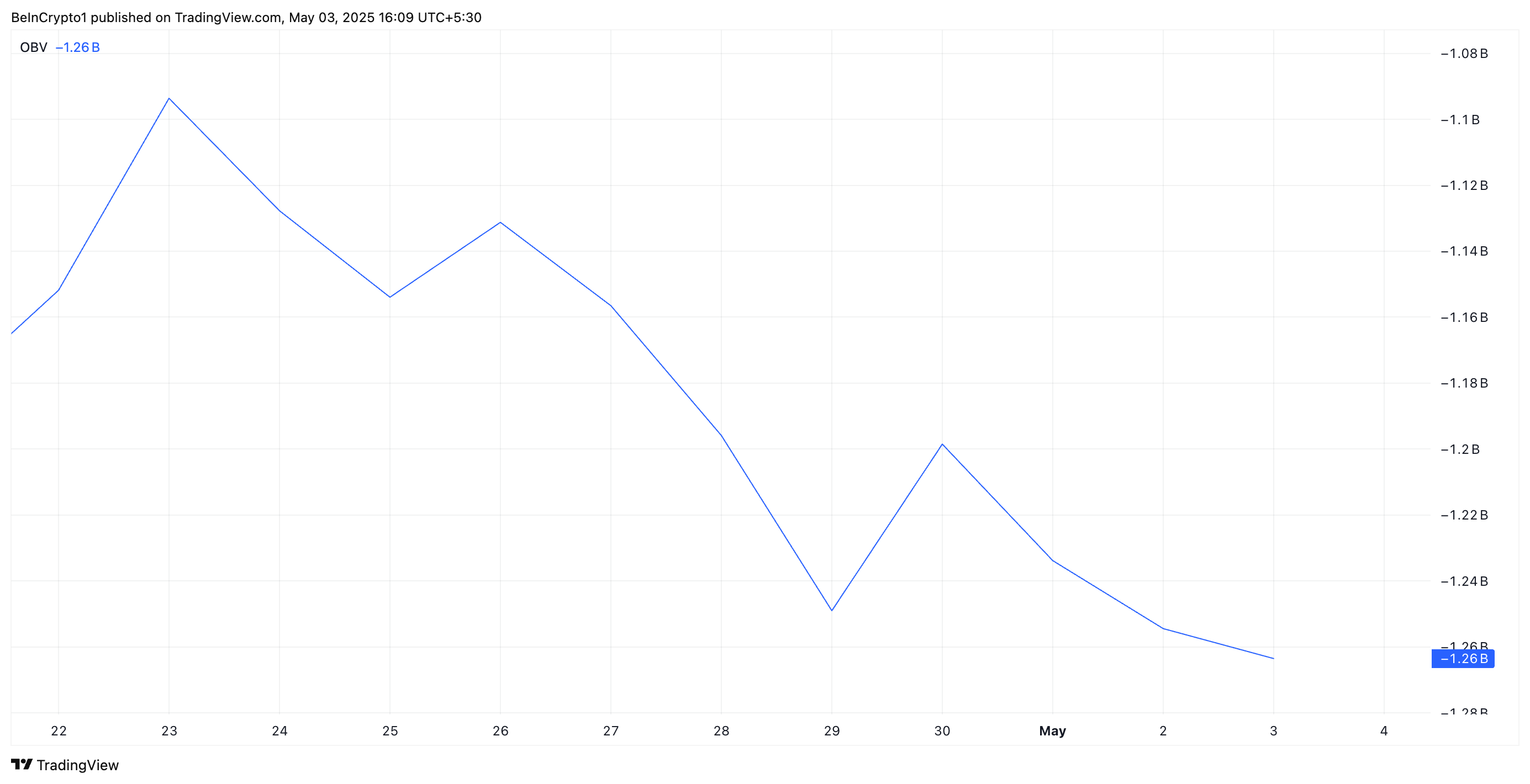 The OBV measures buying and selling pressure by tracking volume flow relative to price movements. When OBV falls like this, more volume is tied to selling than buying. This indicates weakening investor confidence and potential for further price declines.