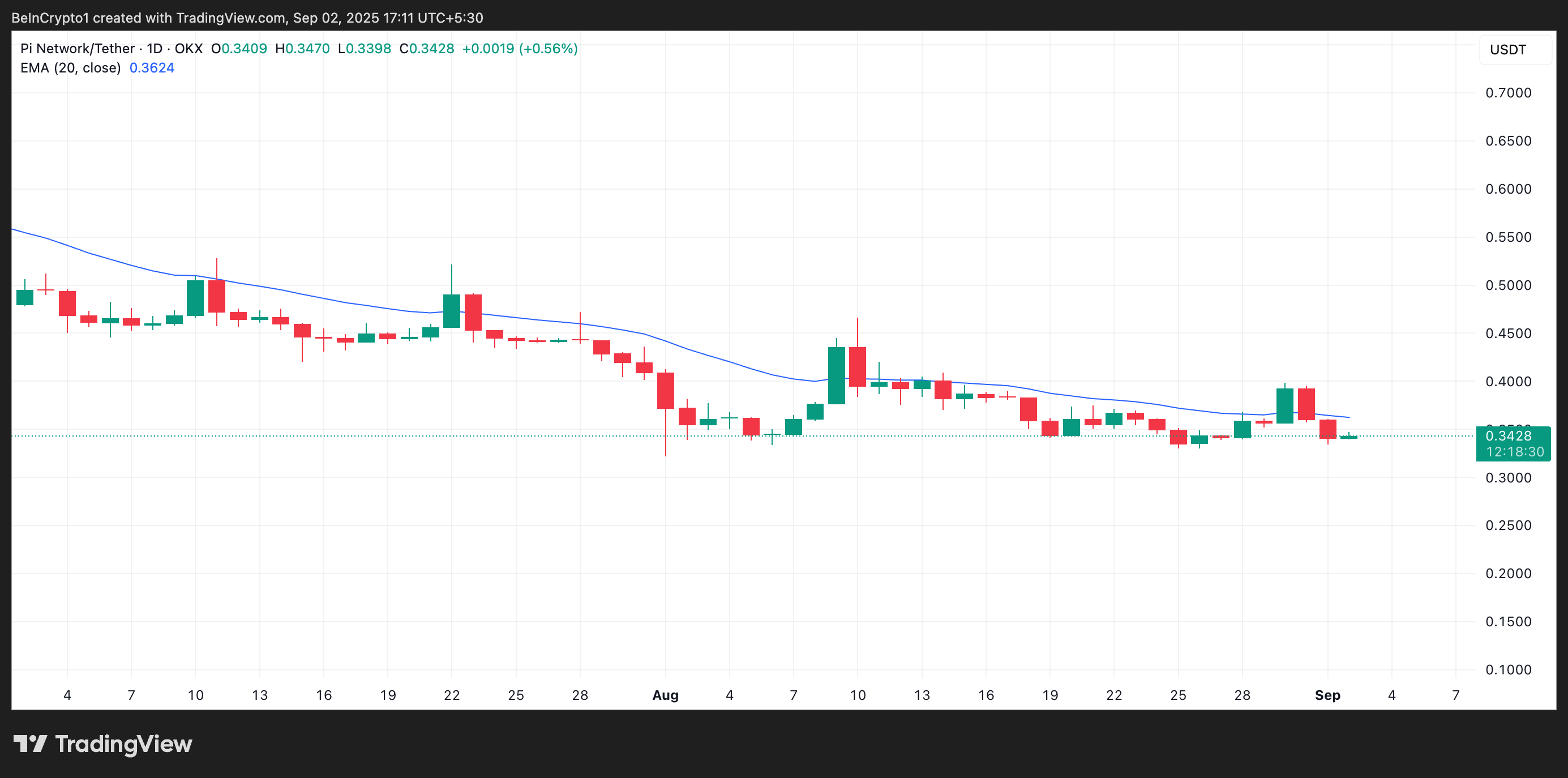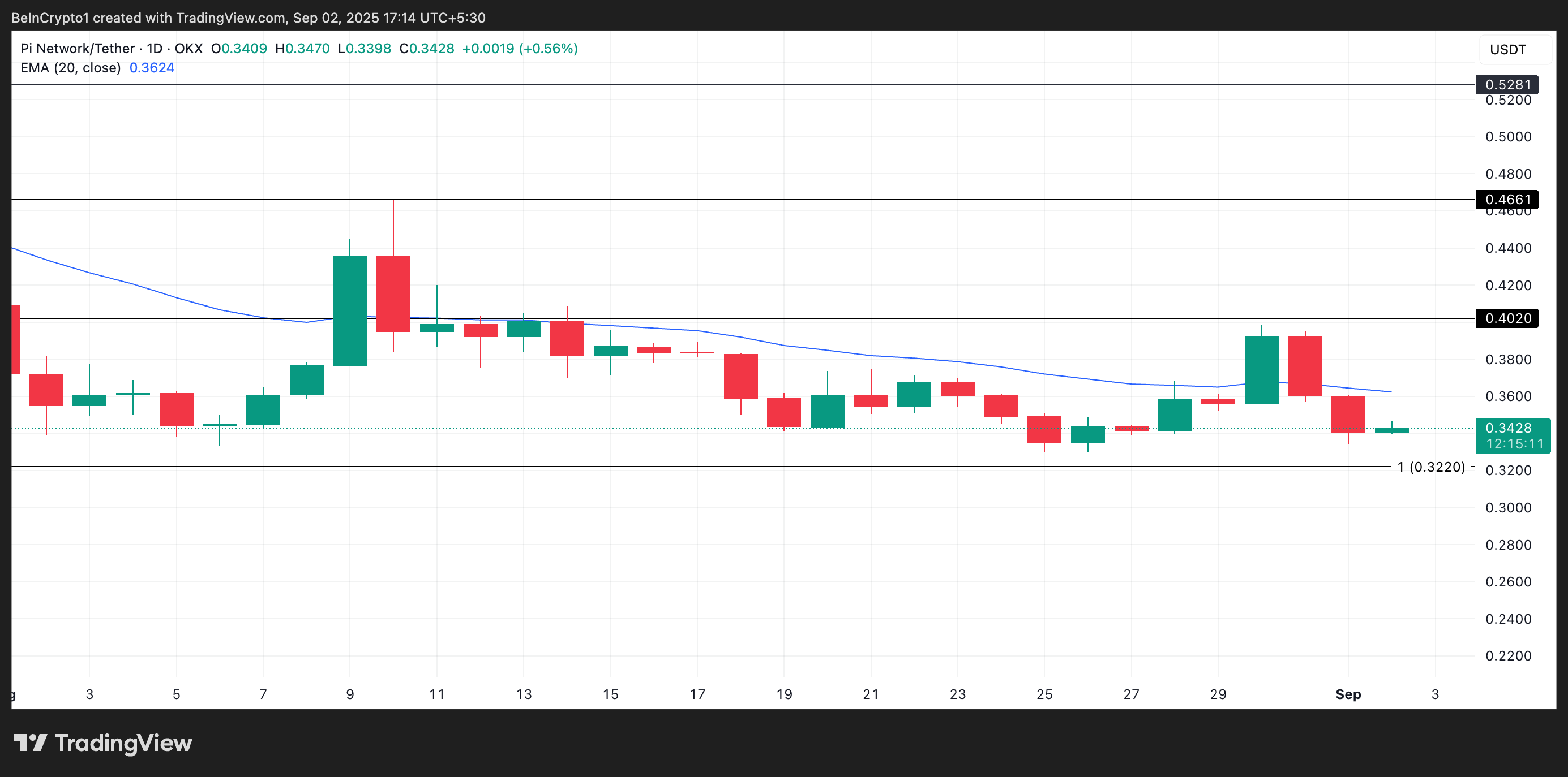 Conversely, if demand picks up, PI could regain momentum and attempt to climb above its 20-day EMA at $0.36. If successful, it could rally further toward $0.40.