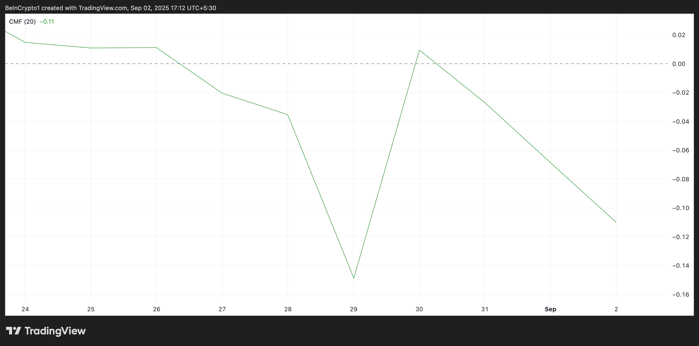 Furthermore, readings from the token’s Chaikin Money Flow (CMF) confirm this bearish outlook. At press time, this momentum indicator, which tracks money flows into and out of an asset, is below the zero line at -0.11.