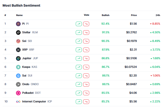 According to data from CoinMarketCap, Pi Network is experiencing the highest bullish sentiment among cryptocurrencies on Pi Day. This reflects the enthusiasm surrounding the project on its big day.