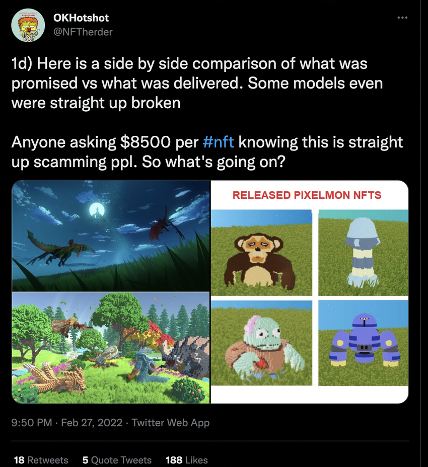 Before the launch, the Pixelmon team declared that the Pokemon-Inspired Metaverse is set to become “the largest, highest quality game NFT space has ever seen.” However, the community was greatly shocked when the team revealed the art because it was nowhere near the “highest quality” promised.