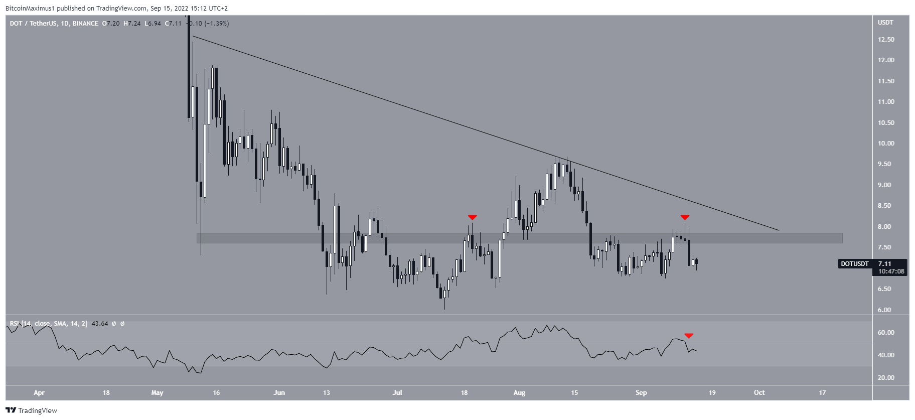 Additionally, DOT decreased below the $7.70 horizontal area, which has now been validated as resistance (red icon). Finally, the daily RSI has now moved below 50.