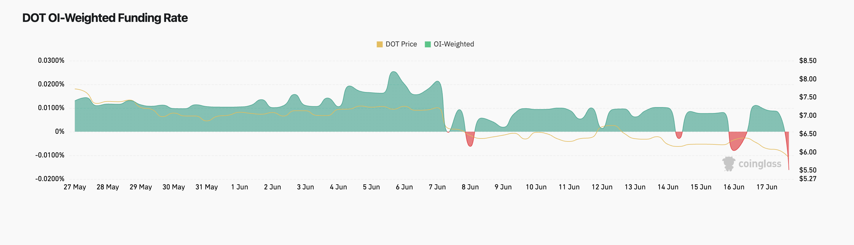 The most significant change occurred between June 16 and June 17, when both the funding rate and DOT’s price experienced sharp declines. The funding rate turning negative again reflects a bearish pressure, aligning with Polkadot dropping from around $6.50 to approximately $5.4. This period of heightened volatility and increased trading volume suggests panic selling or intensified shorting, reinforcing the bearish outlook.