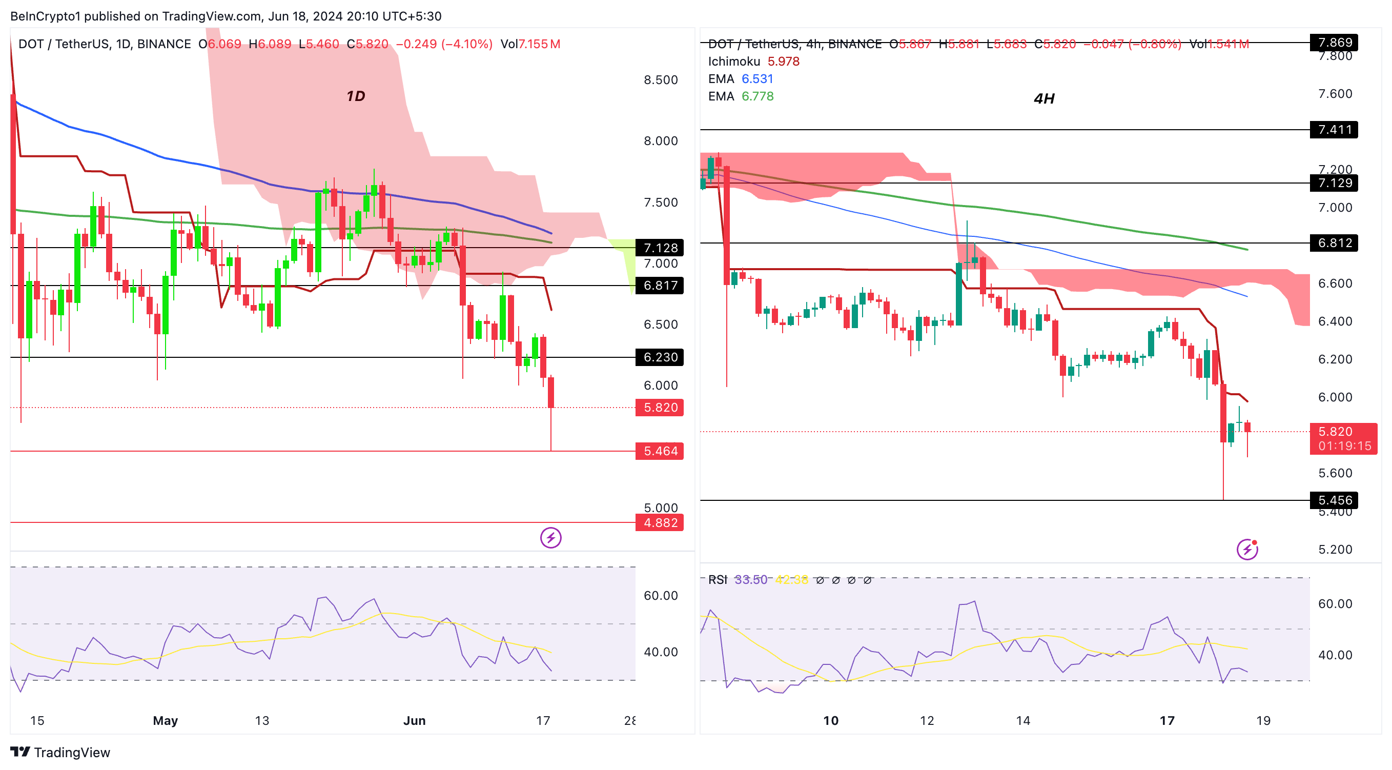 Polkadot (DOT) has been experiencing a bearish trend, evident from the recent price action where it fell below critical support levels. The rejection from the Ichimoku Cloud and testing of lower support levels further emphasize this downtrend.