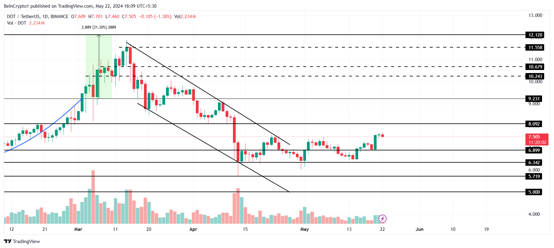 Polkadot’s price trading at $7.50 is close to breaching the resistance at $8.0. Flipping this resistance into support can push the price further up, as it previously served as support before a past uptick.