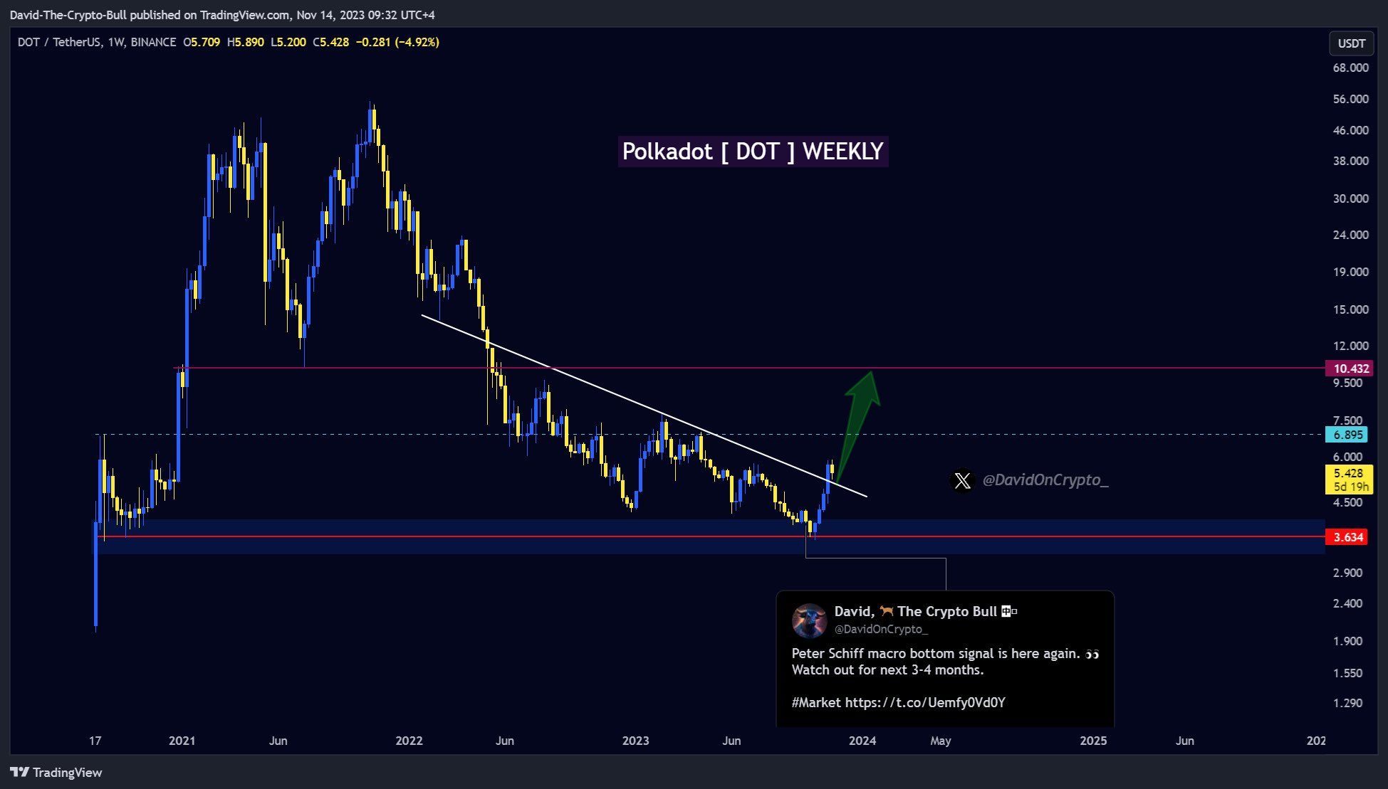 In the analysis of DOT’s weekly time frame, it is observed that the price experienced a decline below a descending resistance trend line starting from February, reaching a low point of $3.56 in October.