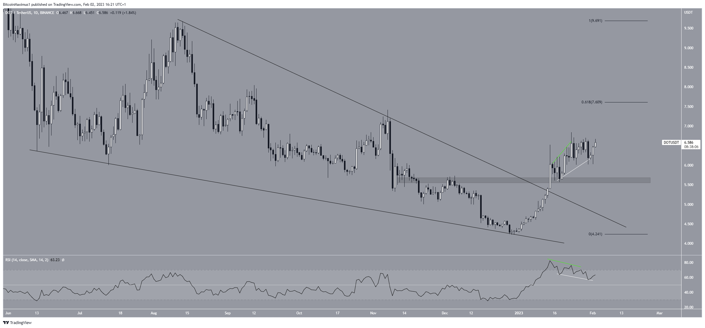 While the DOT token price reached a high of $6.84 on Jan. 23. Afterward, it dropped because the daily RSI generated bearish divergence (green line). However, the RSI has now developed a hidden bullish divergence (white), which is considered a strong sign of trend continuation.Â