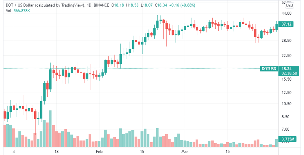 For the sake of comparison, Polkadot opened on Jan 1 2021, with a trading price of $9.29, reached a quarterly high of $42.06 on Feb 20, and closed the first quarter of 2021 at $37.03. Overall, there was a 298% increase in DOT’s opening and closing price in Q1 2021.