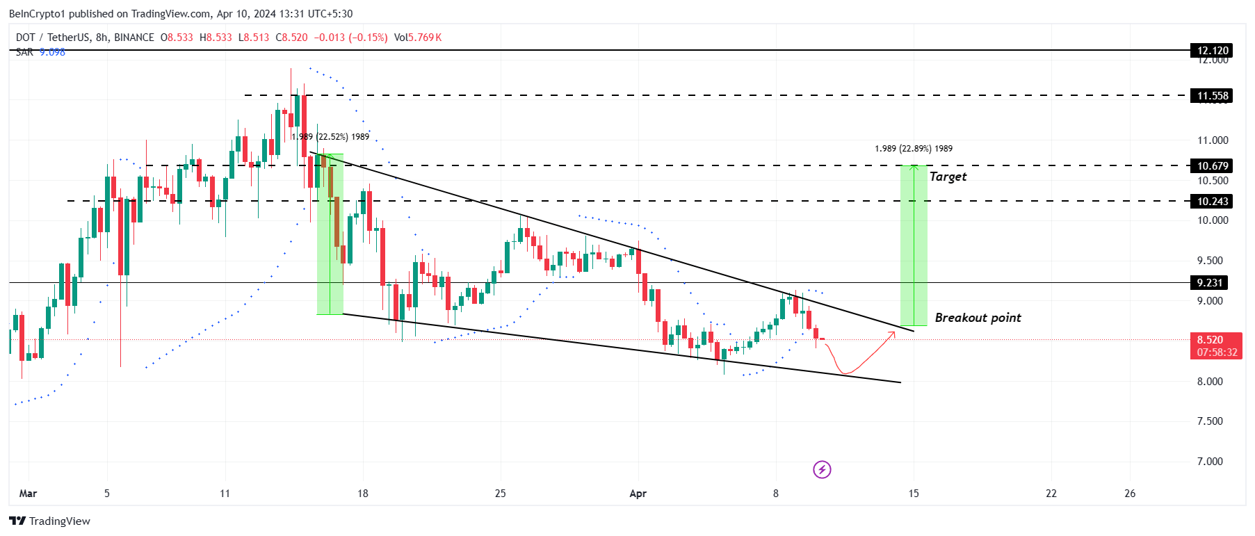 Polkadot’s price trading at $8.5 is currently stuck in a falling wedge pattern, holding the potential to break out in the coming days. A falling wedge pattern is characterized by converging trendlines sloping downward, signaling a potential bullish reversal. A breakout to the upside is often accompanied by increased volume.