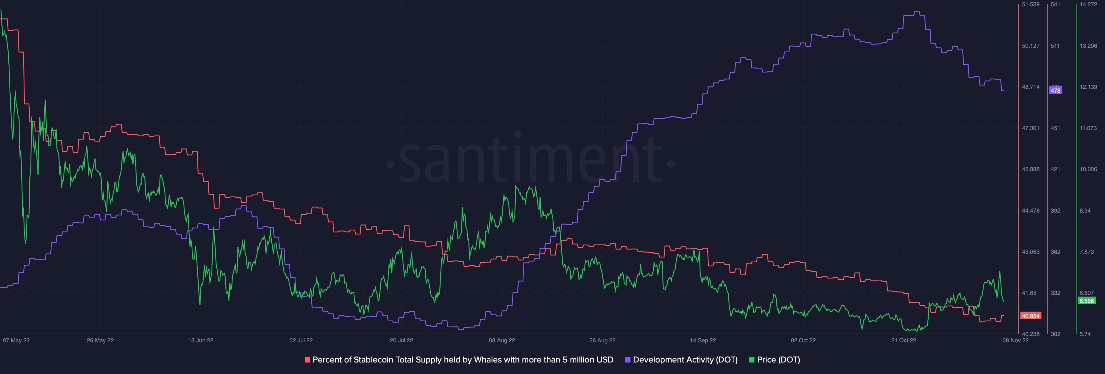 In addition, the percentage of stablecoin total supply held by DOT whales with more than $5 million was also in a drawn-out downtrend. This suggests lowered interest in the coin from whales.