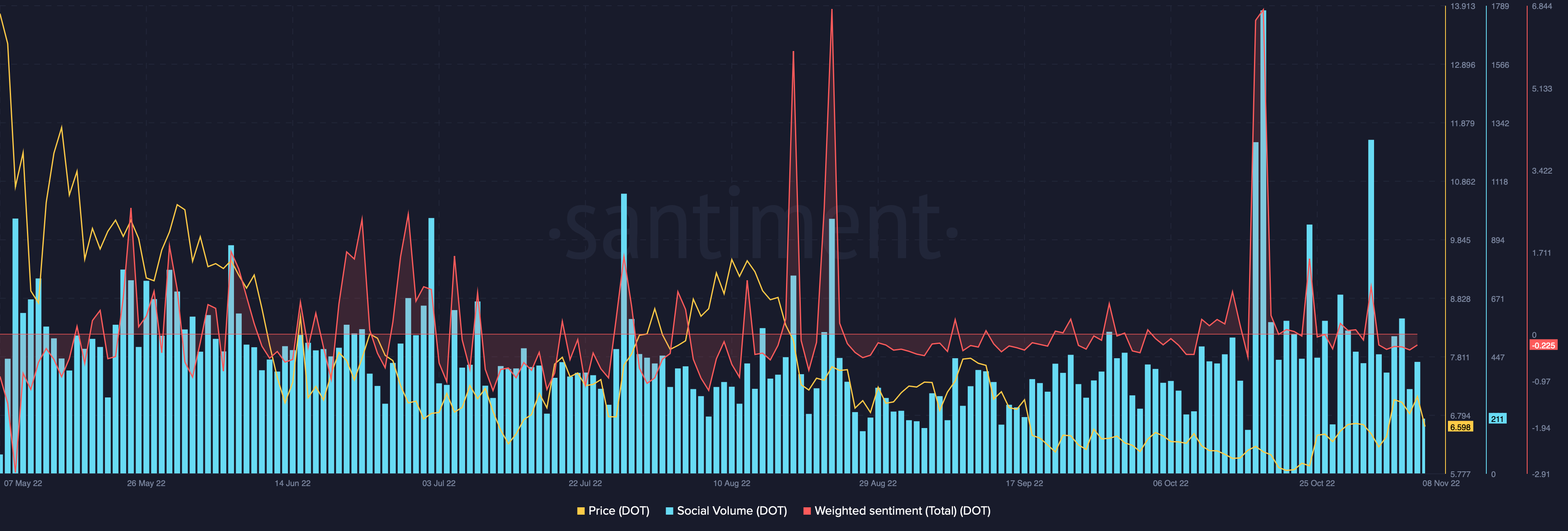 Even though Polkadot remained in the news, its weighted social sentiment had been negative for most of the last week. DOT social volumes, after peaking on Nov. 1, have also started to lose momentum.