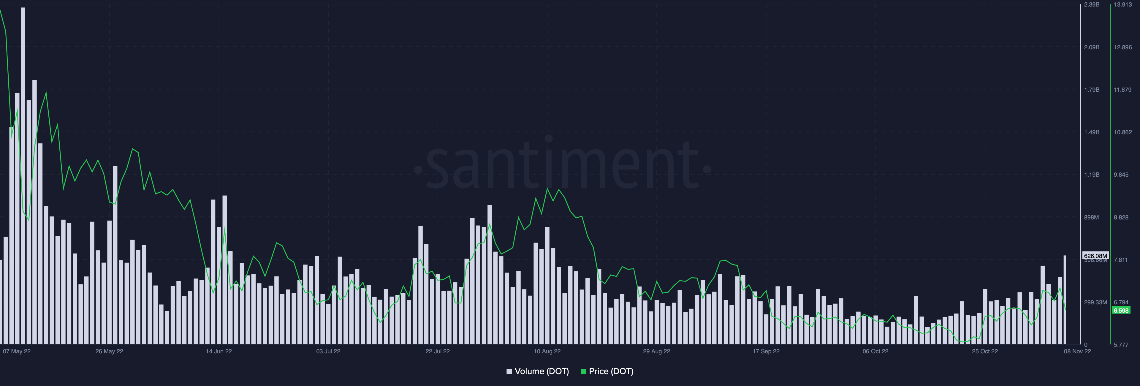 Despite the weak price momentum and negative sentiment, trading volumes maintained a high level. Trade volumes for DOT were at a similar level at this time in August when the Polkadot price was above $9.
