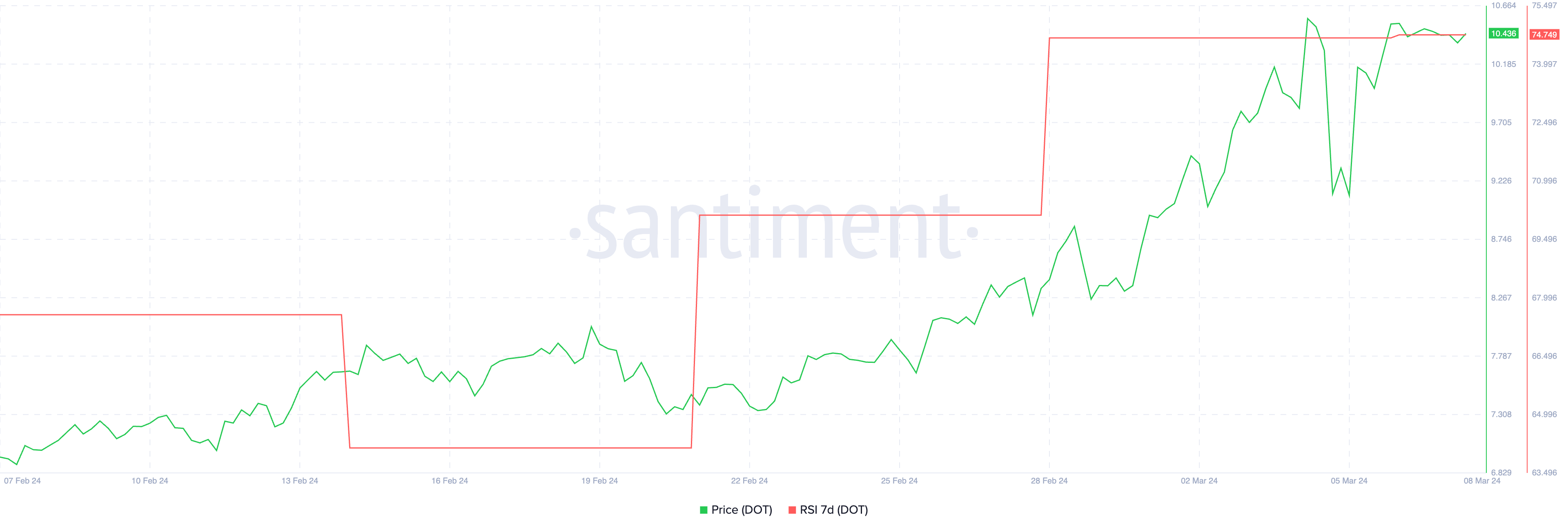 DOT Relative Strength Index (RSI) levels recently crossed the 74.7 mark. An RSI reading at this level suggests that the asset is potentially overbought. This means that the asset’s price may be considered too high relative to its recent price history, and it could indicate a reversal or pullback in price might be forthcoming.