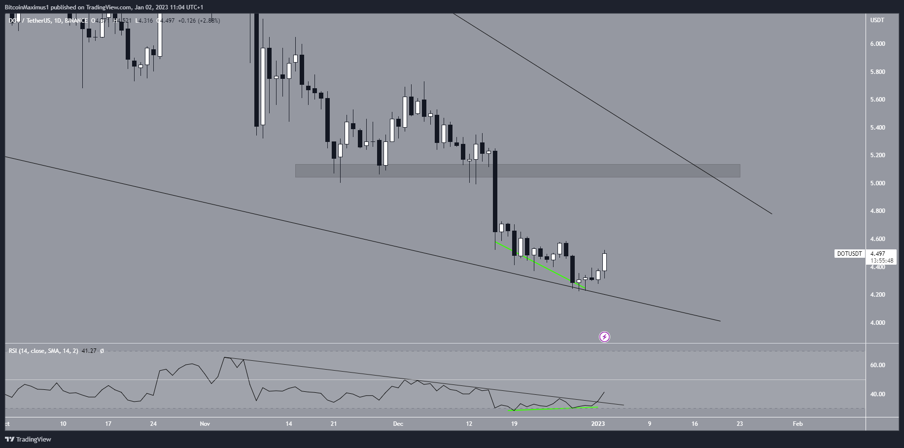 Secondly, the daily RSI generated bullish divergence (green line) before the breakout. The indicator is now moving toward the 50 line, which could also provide resistance. If the rates of increase hold for both the RSI and the DOT price, the price will reach the $5.10 area at the same time the RSI reaches the 50 line.