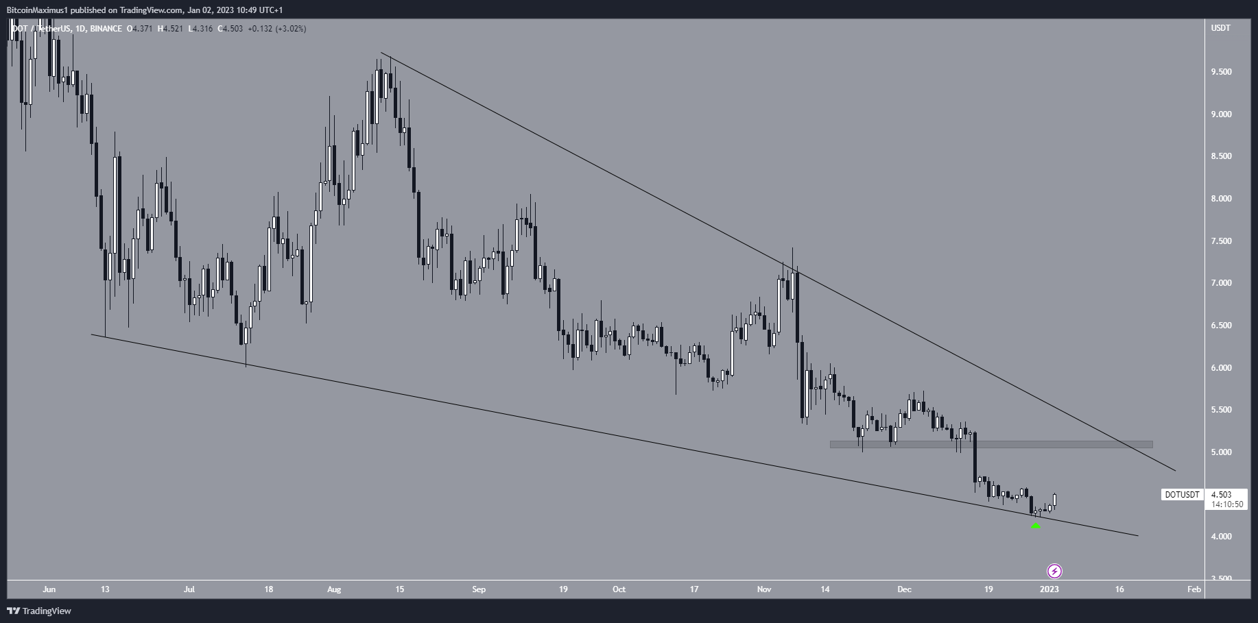 The Polkadot price has fallen inside a long-term descending wedge since June 13. The decrease led to a minimum price of $4.22 on Dec. 29, before a bounce ensued.