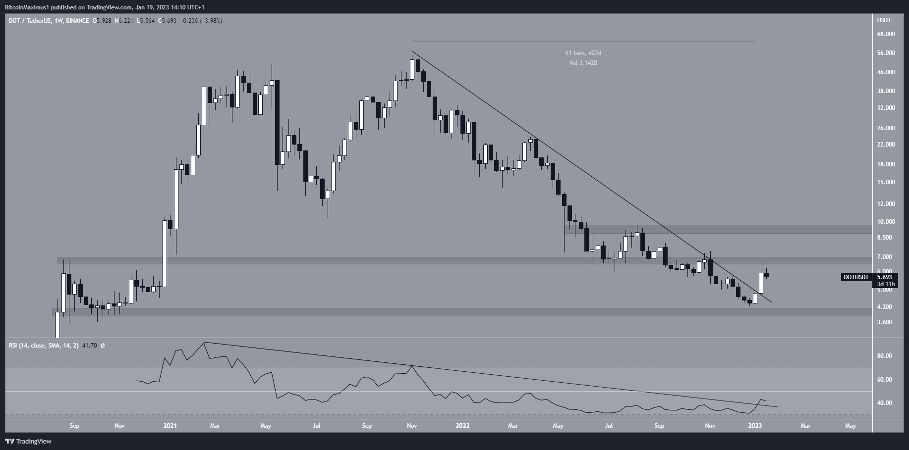 Currently, the DOT coin price is at the $5.60 horizontal area, attempting to validate it as support.