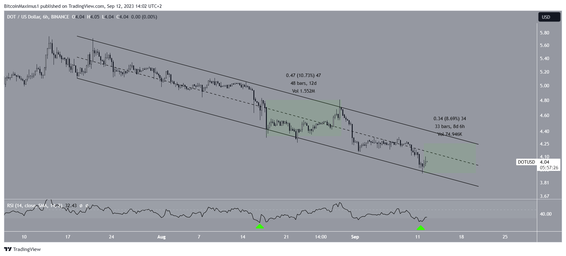 The weekly timeframe technical analysis shows that DOT has fallen under a descending resistance line since its yearly high of $7.90 in February 2023. While following the line, the price broke down from the $4.40 horizontal support area, which had been in place since the beginning of the year. Breakdowns from such long-term support levels often catalyze significant falls.