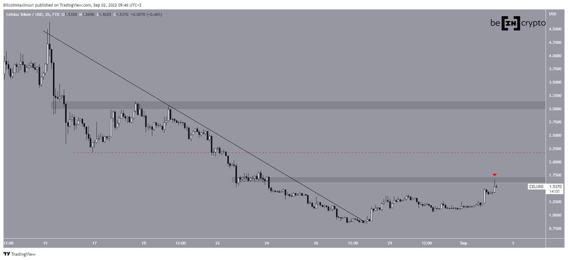 On Aug 28, CEL broke out from a descending resistance line that had been in place since Aug 15. It began an upward movement afterwards and has so far reached a high of $1.67 on Sept 2, before it was rejected by the $1.65 resistance area (red icon).