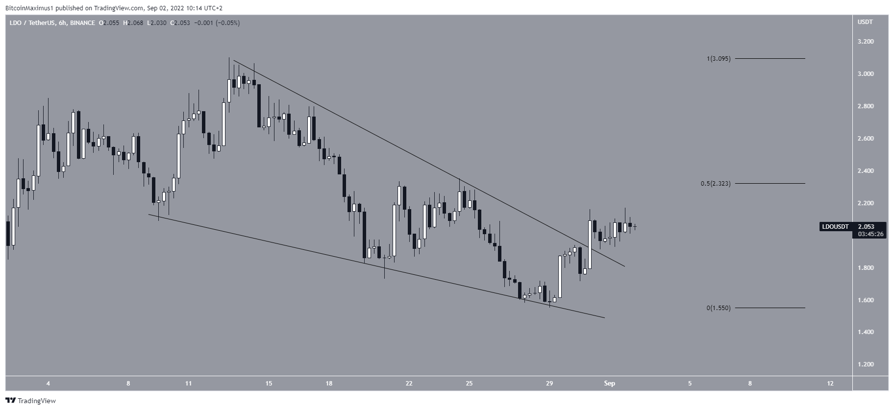 LDO had been decreasing inside a descending wedge since Aug 8. The wedge is considered a bullish pattern, meaning that a breakout from it would be the most likely scenario.
