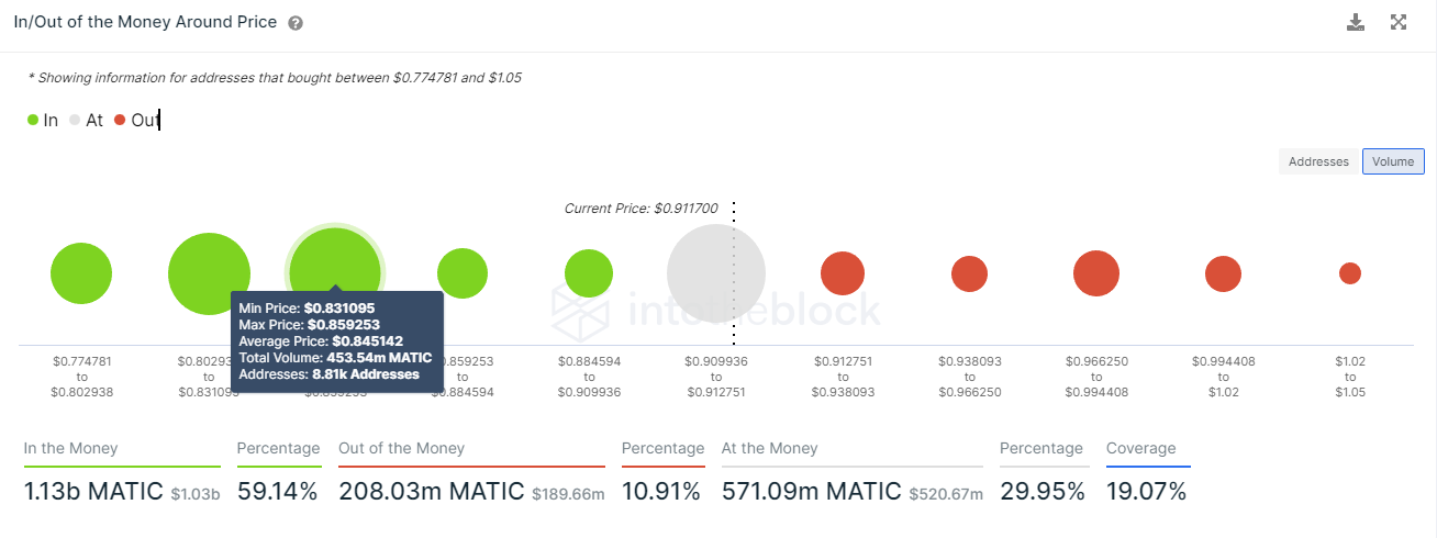 At press time, Polygon price traded at $0.907, noting a 2.30% loss on the daily as the larger market saw a weakening price action. A look at In/Out of Money Around Price indicator presented no major supply barriers for MATIC going forward.