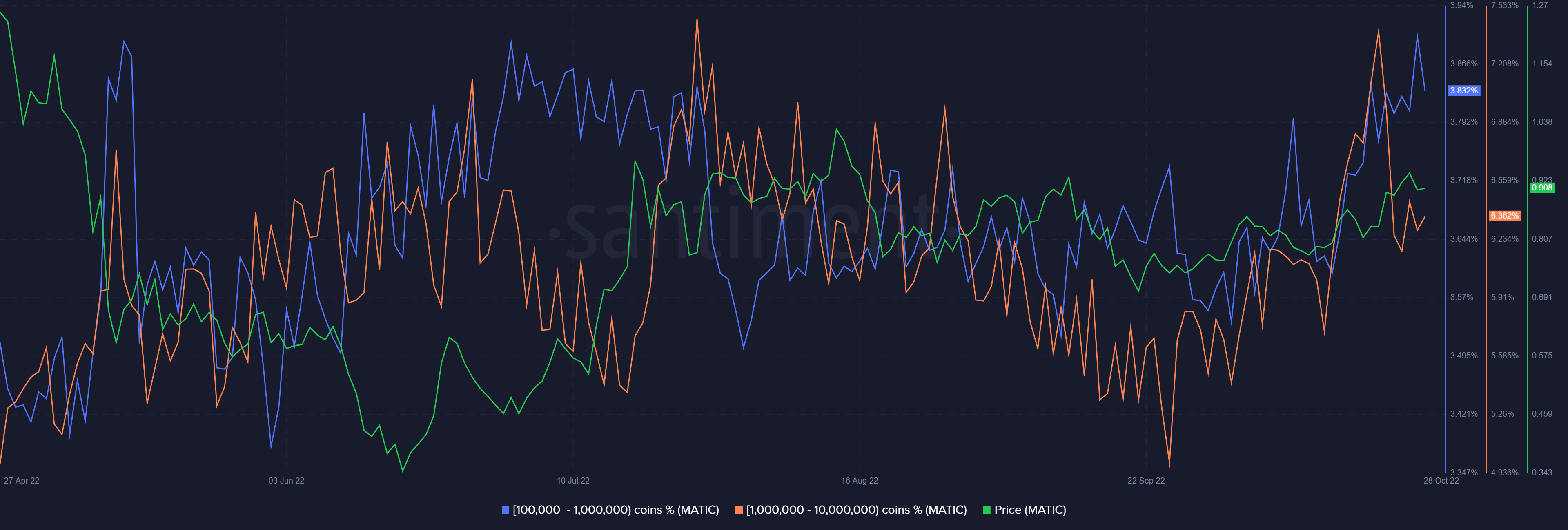 MATIC supply distribution by the balance of addresses presented that higher balance addresses saw a sharp rise from Sept. 25 to the time of writing.