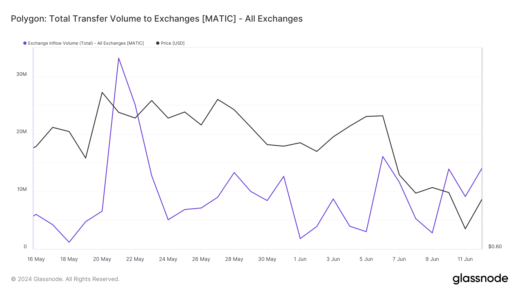 On June 4, the total inflow volume to exchanges stood at approximately 3.96 million MATIC. By June 12, this volume had surged to around 13.98 million MATIC, reflecting a significant increase of 10 million MATIC.