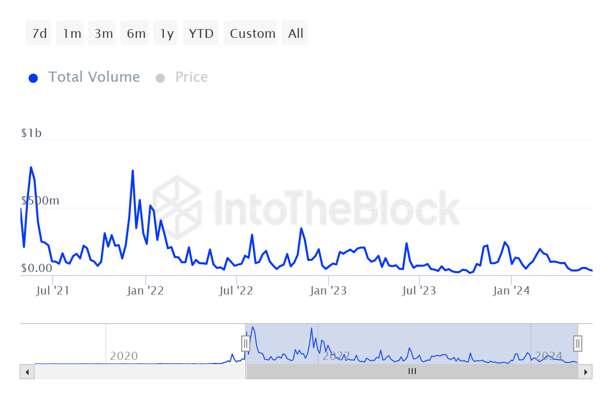 MATIC price has impacted the total transaction volume generated on the network. This has reached a significant low, mirroring levels seen in December 2023. Currently, the transaction volume stands at under $33 million, highlighting a considerable reduction in network activity.