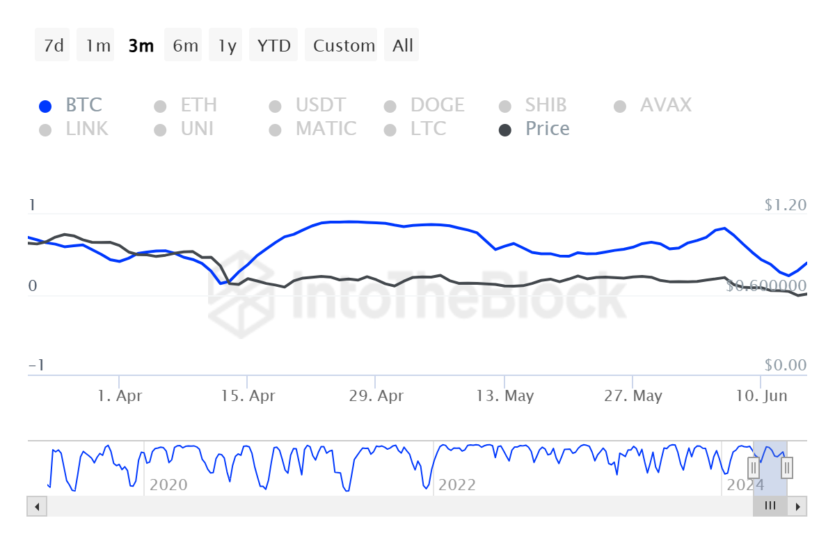 In addition to the concerning transaction volume, MATIC is experiencing a unique challenge due to its low correlation with Bitcoin. If Bitcoin were to rise significantly, MATIC might not benefit from the same upward momentum. This disconnect could hinder MATIC’s recovery efforts, leaving it less responsive to broader market gains driven by Bitcoin.
