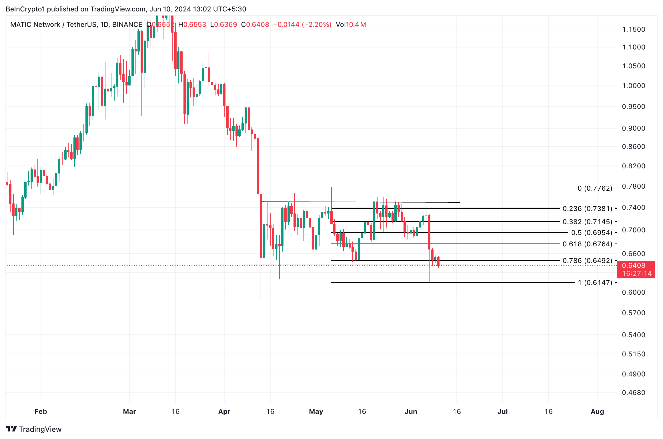 MATIC exchanged hands at $0.63 at press time, its lowest price since October 2023. Since April 13, its price has oscillated within a horizontal channel, bouncing between resistance at $0.75 and support at $0.64.