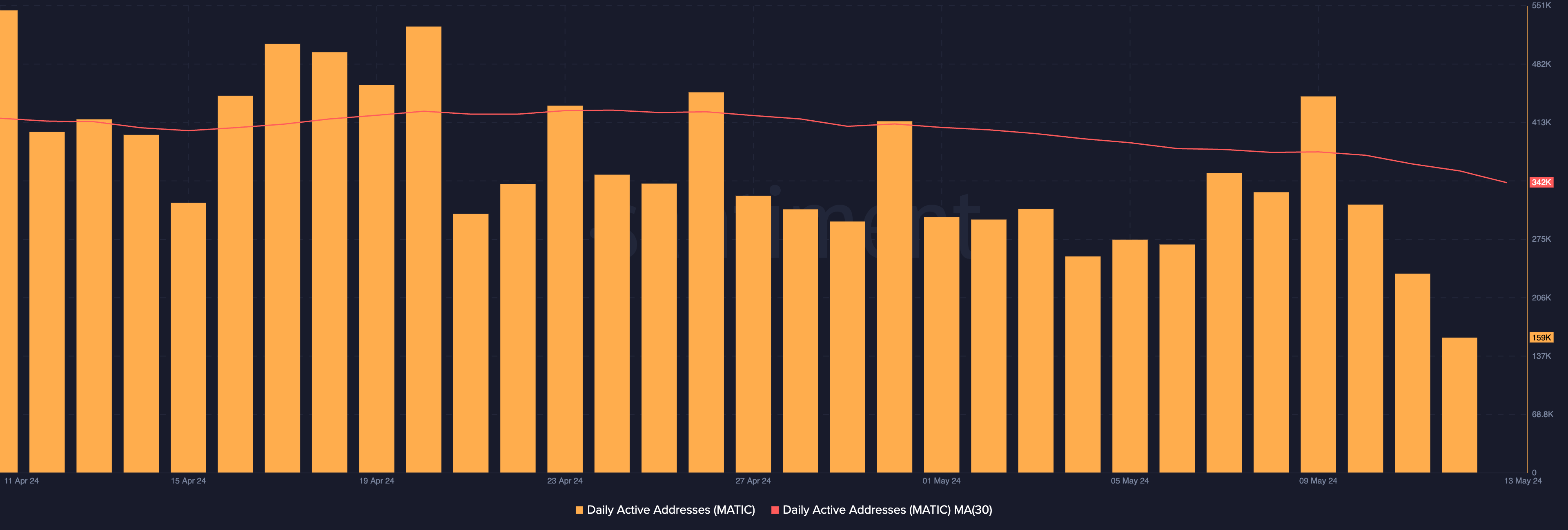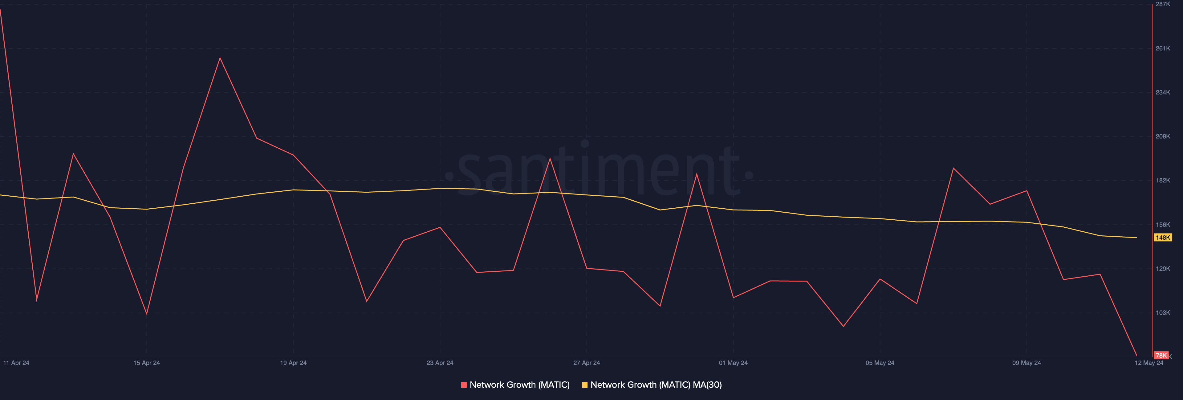 The period under review has also been marked by a decrease in the demand for MATIC. MATIC’s Network Growth, which tracks the daily number of new addresses created to trade MATIC, has declined since April 20. Between April 20 and May 12, new demand for MATIC dropped by 15%.
