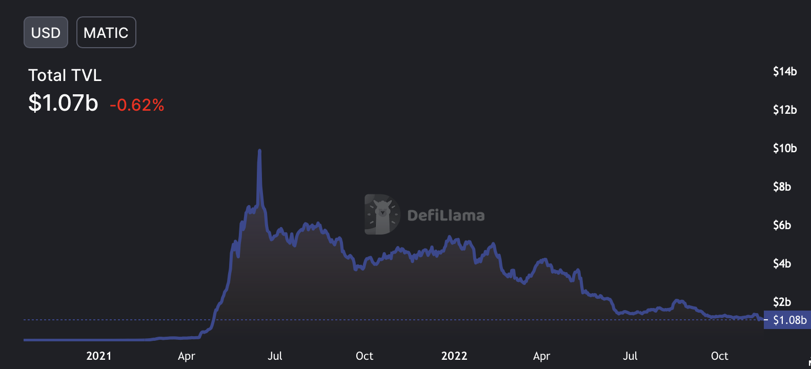 However, the total value locked (TVL) in Polygon DeFi has continued to drop. Polygon TVL fell from an all-time high of $49.89 billion in June 2021 to a low of just over $1 billion at press time.