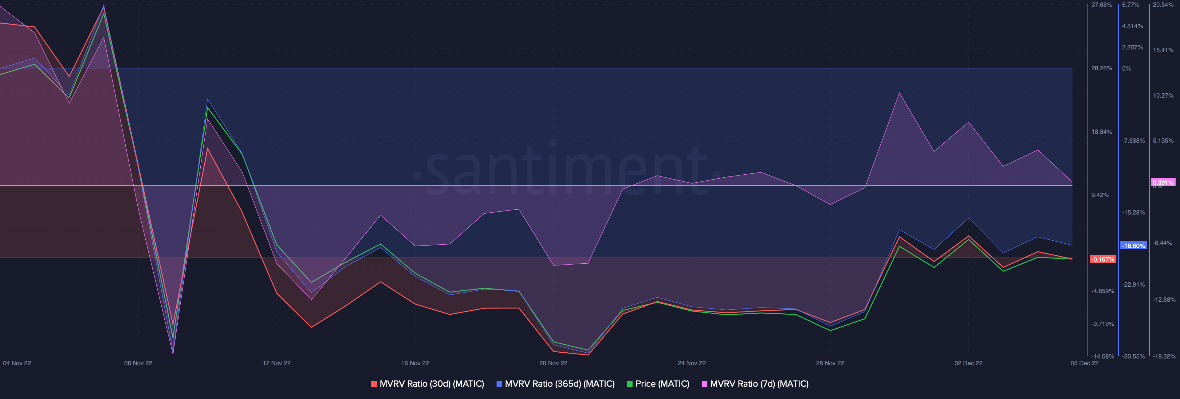 In addition, the 7-day MVRV for MATIC is heading in the negative zone. If the MATIC price continues to drop, short-term holders will be back at a loss. The 30-day and 365-day MVRV for MATIC was also in the negative, meaning that even long-term holders were back underwater.