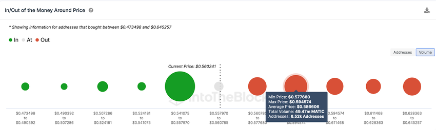 SponsoredThe In/Out of Money Around Price data, which depicts the entry price distribution of the current MATIC holders, also emphasizes this prediction. It depicts that 6,520 wallet addresses had bought 49.5 million MATIC tokens at the maximum price of $0.59.