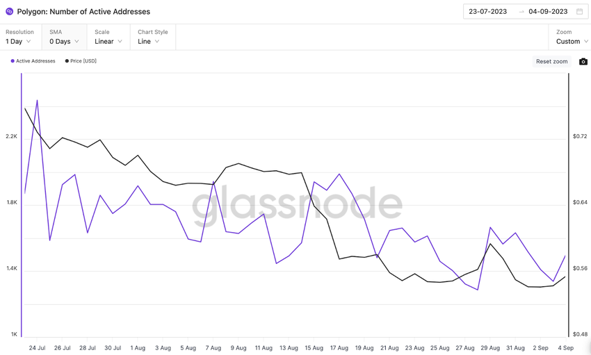 The Glassnode chart below shows that Polygon hit 1,989 Active Addresses on August 17 and has continued dropping to new lows. As of September 4, only 1,499 wallet addresses interacted on the Polygon network, showing a 25% drop in network traction from August 17.