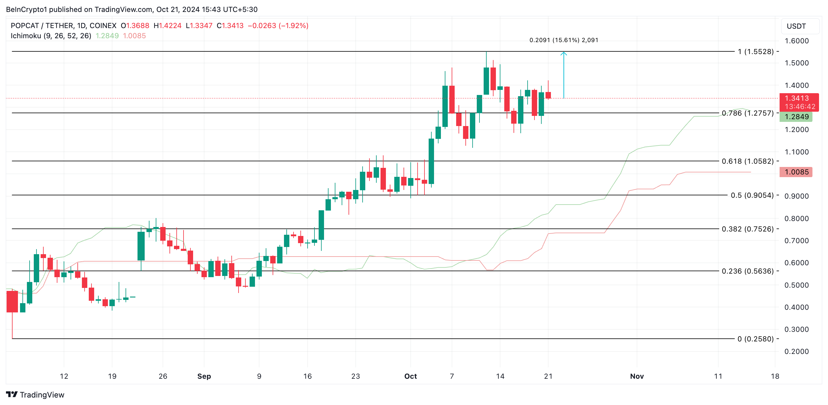 As of this writing, POPCAT trades at $1.34, above the support line of $1.28 formed by the Leading Span A of its Ichimoku Cloud. If the current bullish momentum continues, POPCAT could see a further rally of 16%, potentially reclaiming its all-time high of $1.55.