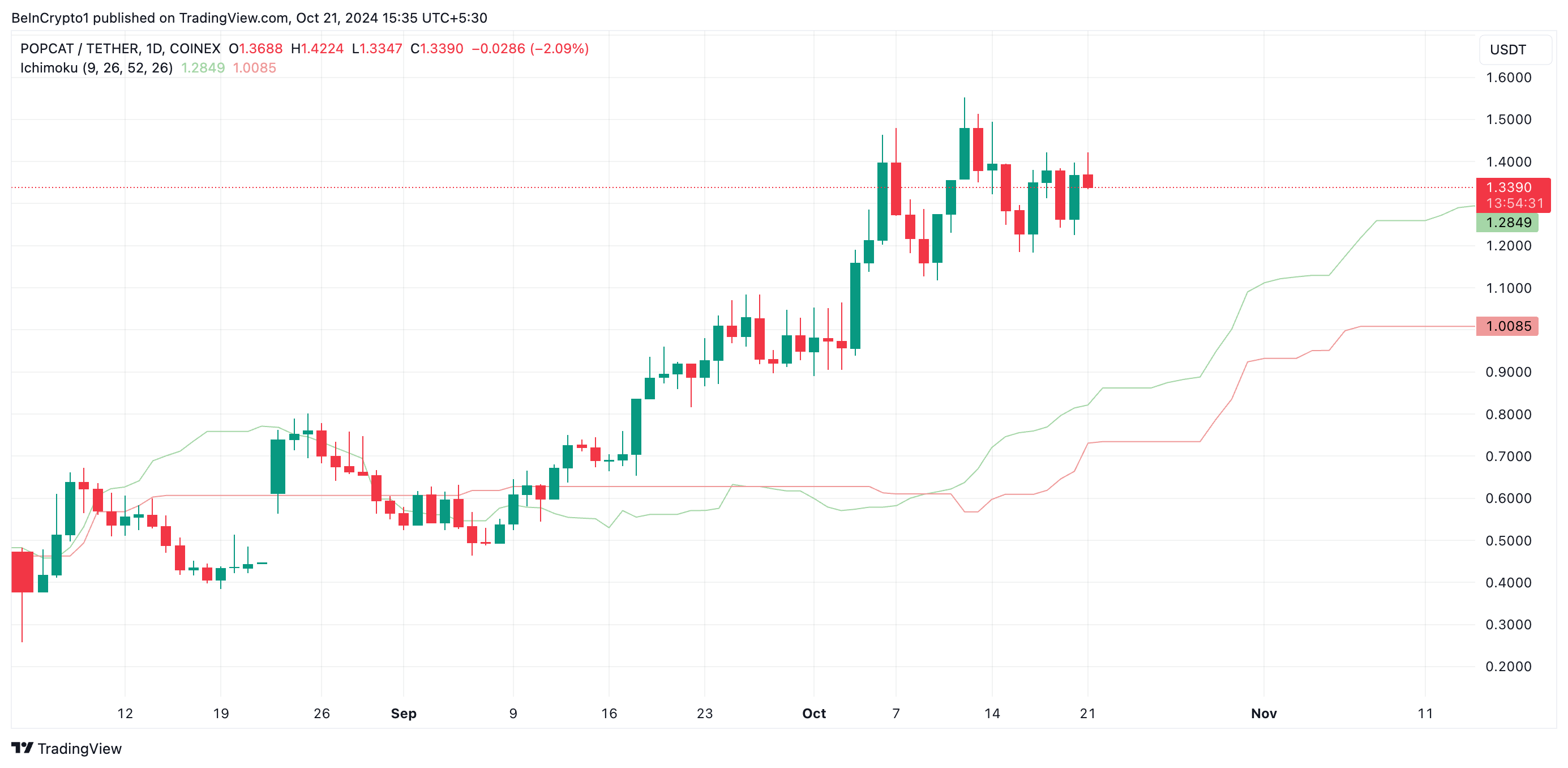 When an asset’s price rises above the cloud, it signals a bullish trend. POPCAT has remained above the cloud on its one-day chart since September 1, indicating sustained strength.