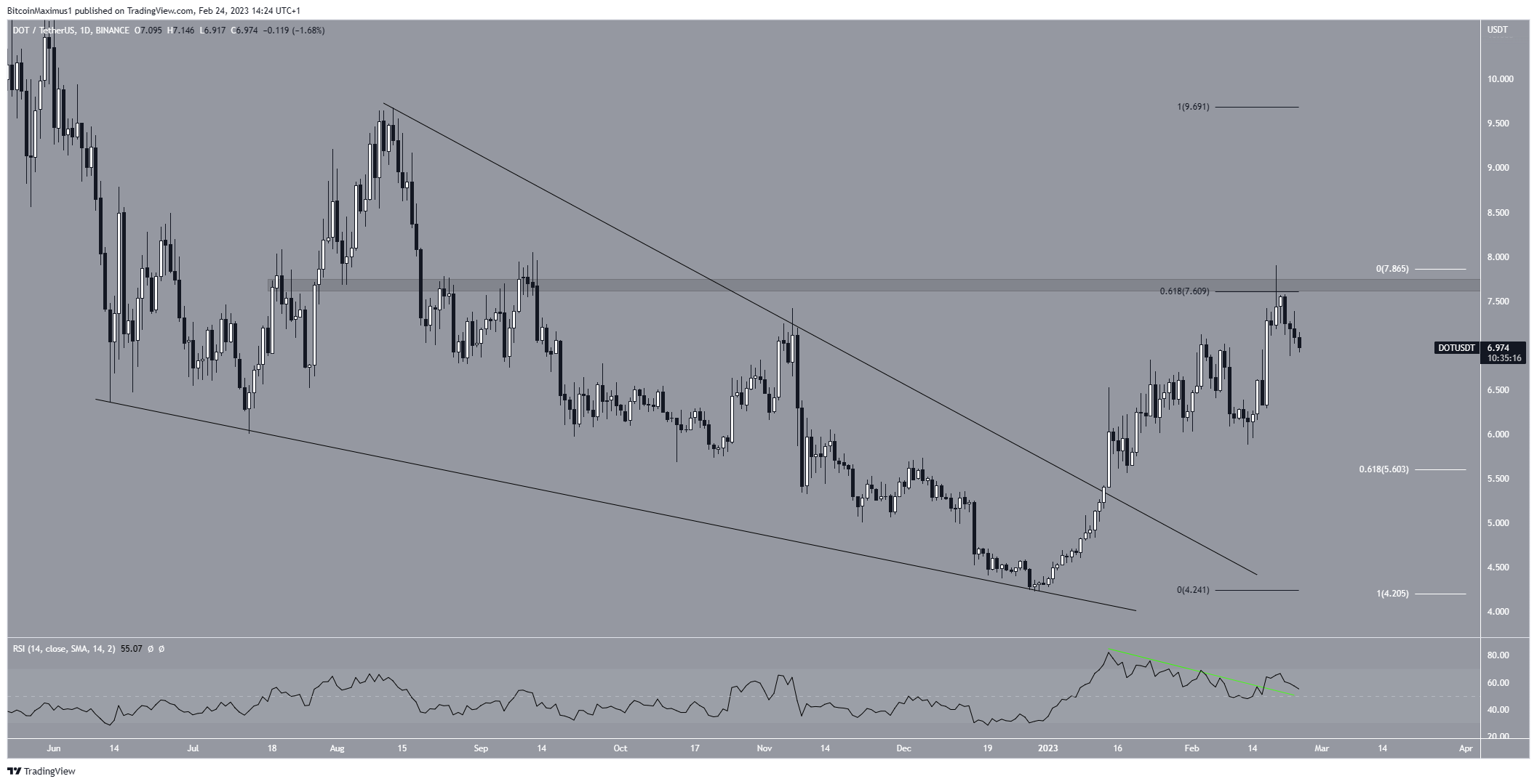 Therefore, a breakout above $7.65 is the most likely scenario. If this occurs, it could take the DOT price to $9.70.