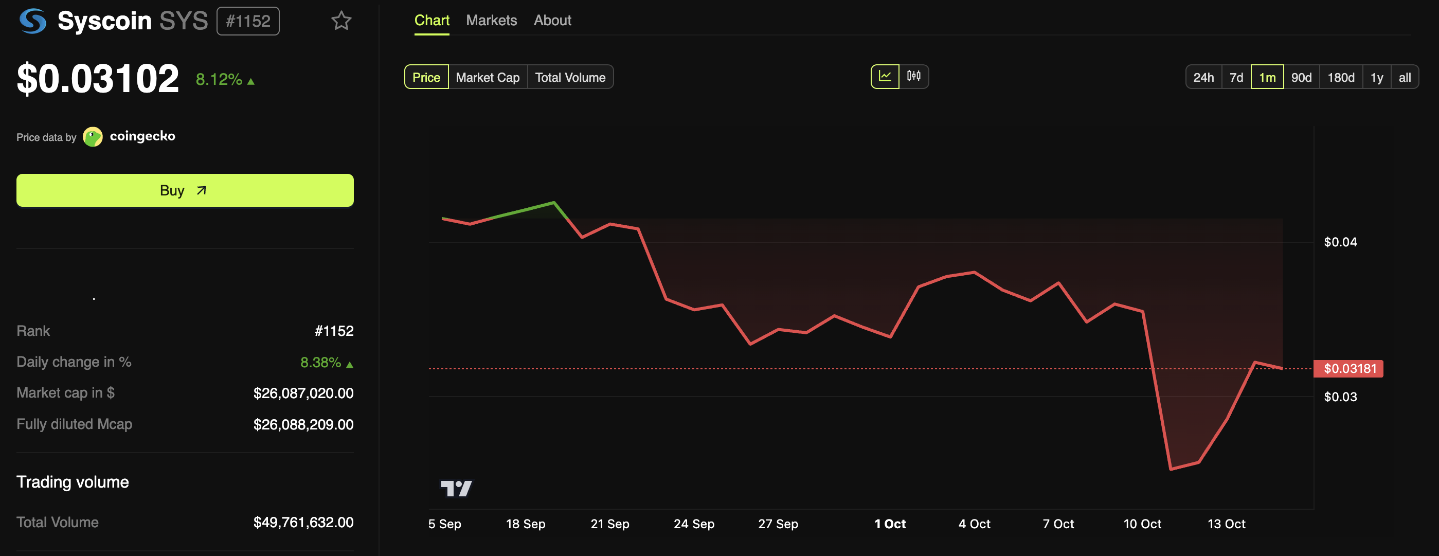 The network’s native token, SYS, has a 24-hour trading volume of over $50 million. This represented an increase of over 1,200%, while the market cap stayed near $26 million. This has resulted in a Vol/Mkt Cap ratio of 1.92 (or 192%), suggesting strong market activity and potential growth if momentum lasts.