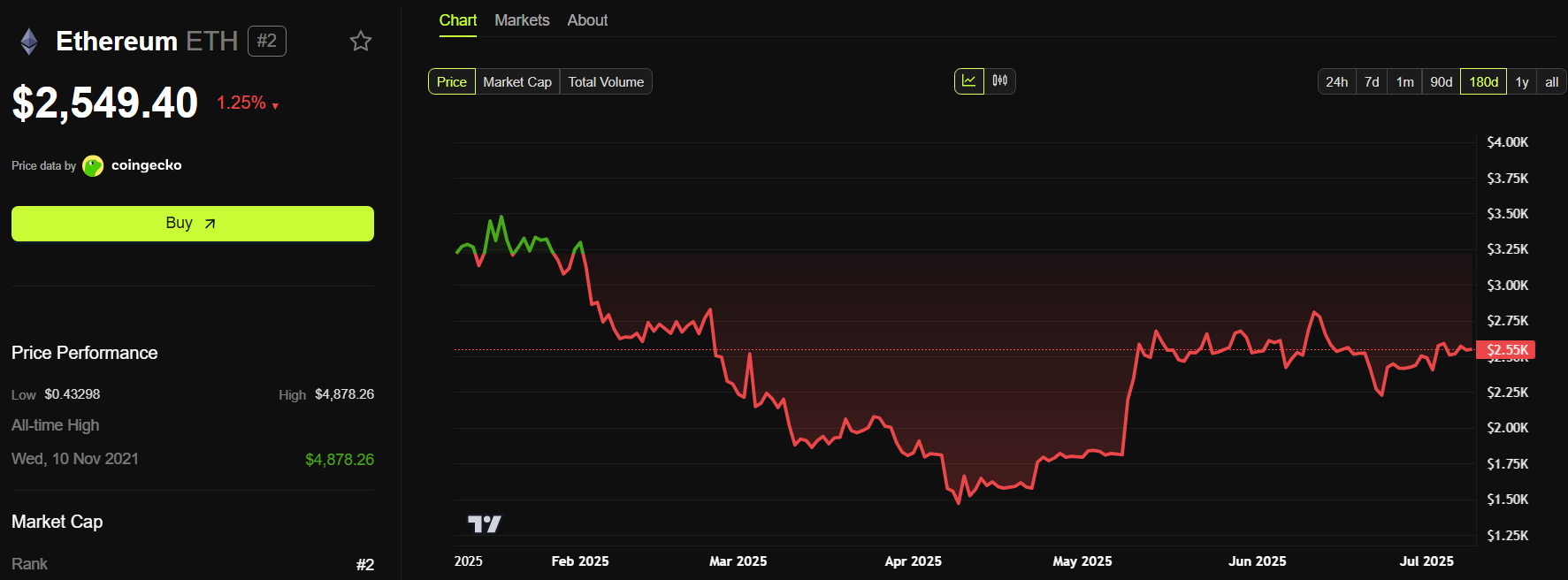 At the time of writing, ETH trades around $2,550. ETH’s price is still half of its all-time high from 2021.
