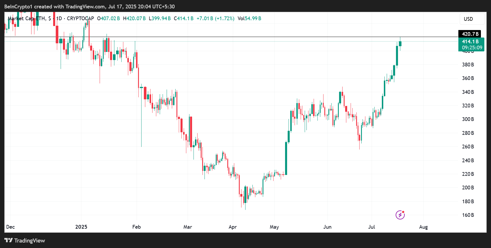 According to data on TradingView, Ethereum’s total market capitalization surged past $420 billion on Thursday, July 17, before a pullback.