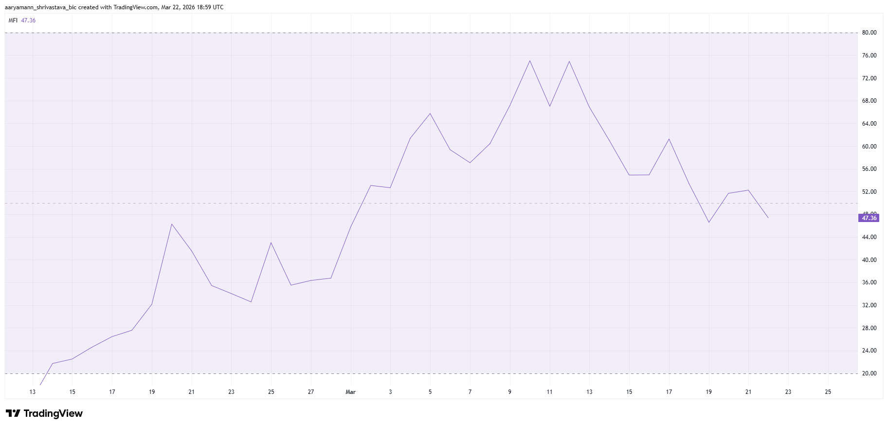 That reading has since reversed. The MFI now sits at 47.36, a neutral but declining reading. It made a secondary lower peak near 62 around March 17 before rolling over again.
