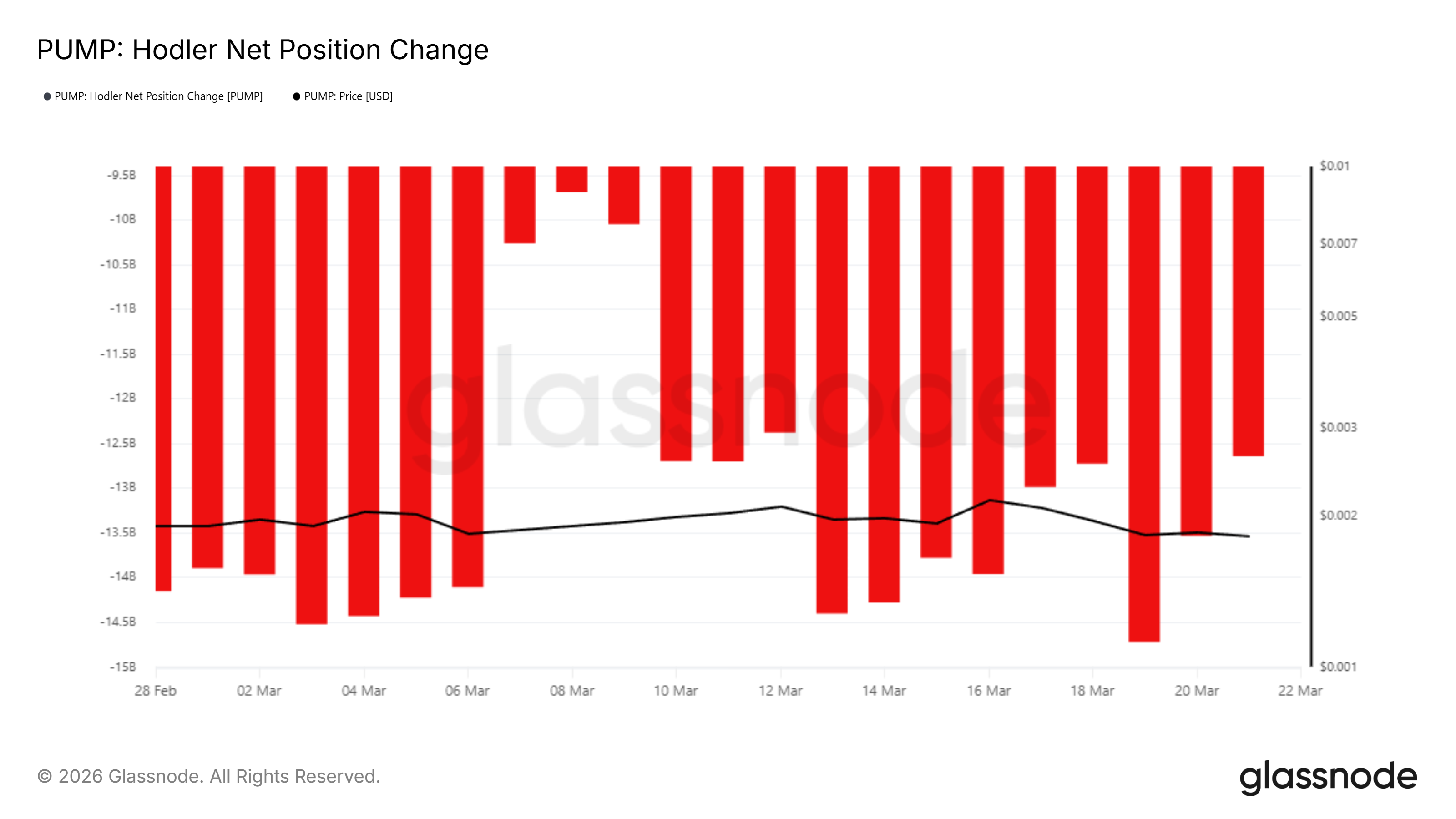 Hodler Net Position Change data from Glassnode shows uninterrupted red bars across every trading day from February 28 through March 22. There is no green bar in the entire chart — not one day of net accumulation by long-term PUMP holders.