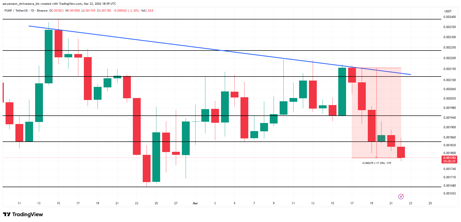 The daily chart shows PUMP has been trading beneath a descending trendline since February 13. Every rally attempt has been capped at or near that falling resistance, which now sits around $0.002140. The March 17–22 distribution zone between $0.001860 and $0.002160 marks where the most recent sellers were active.