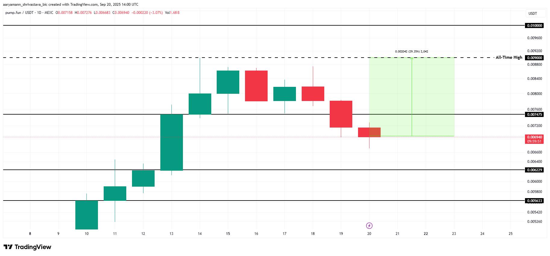 Alternatively, PUMP could invalidate the bearish thesis if it manages to flip $0.0074 into a support floor. Achieving this would give the token enough momentum to climb back toward its ATH of $0.0090, provided investor backing remains strong.0, provided investor backing remains strong.