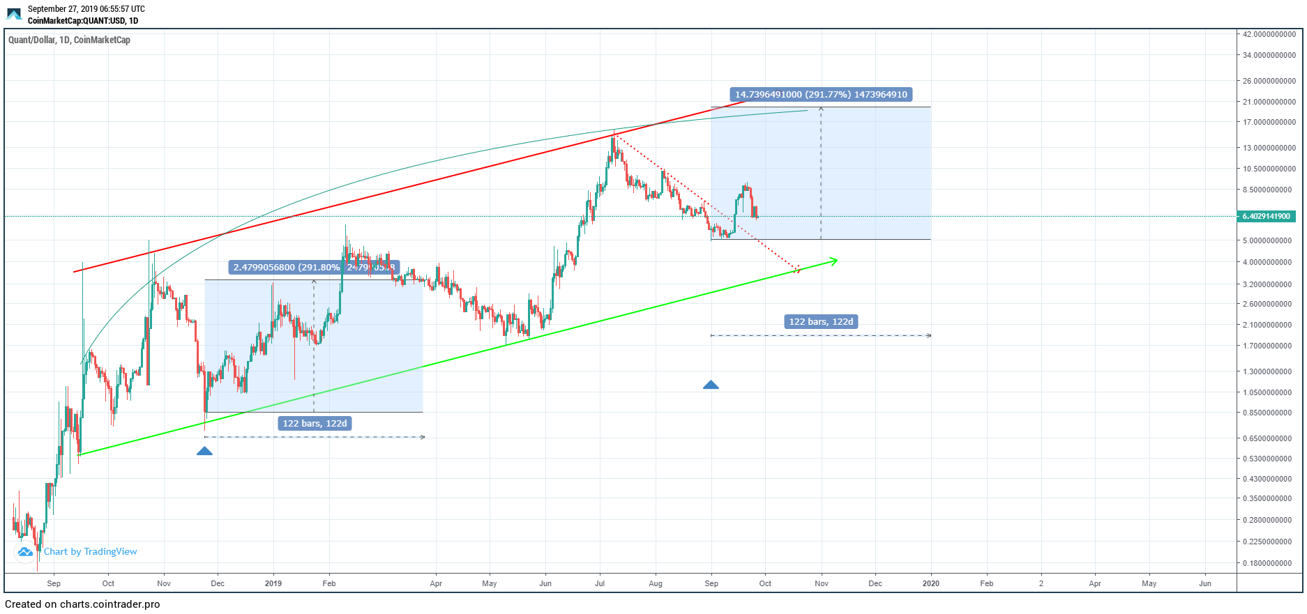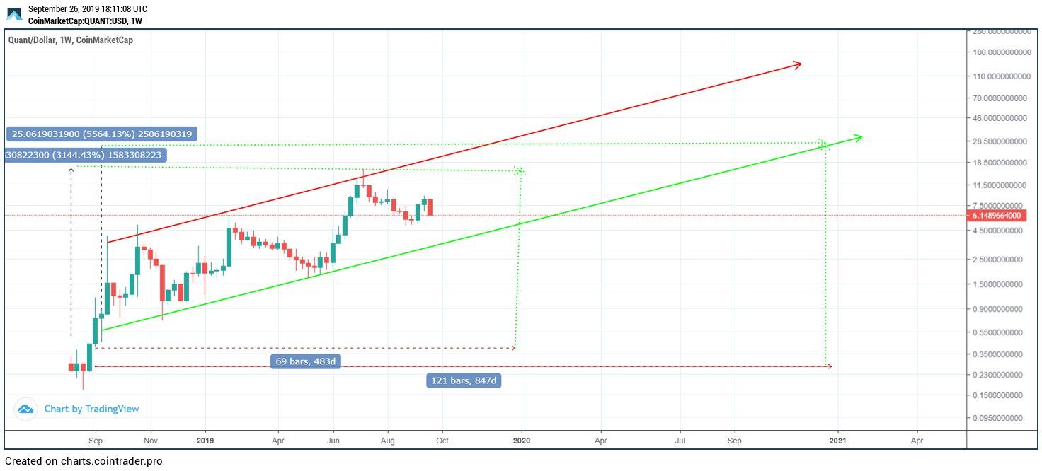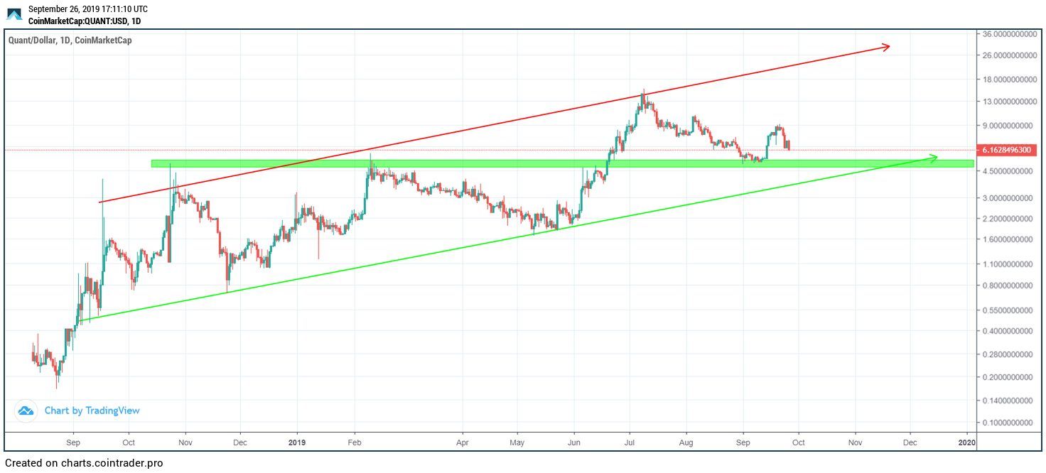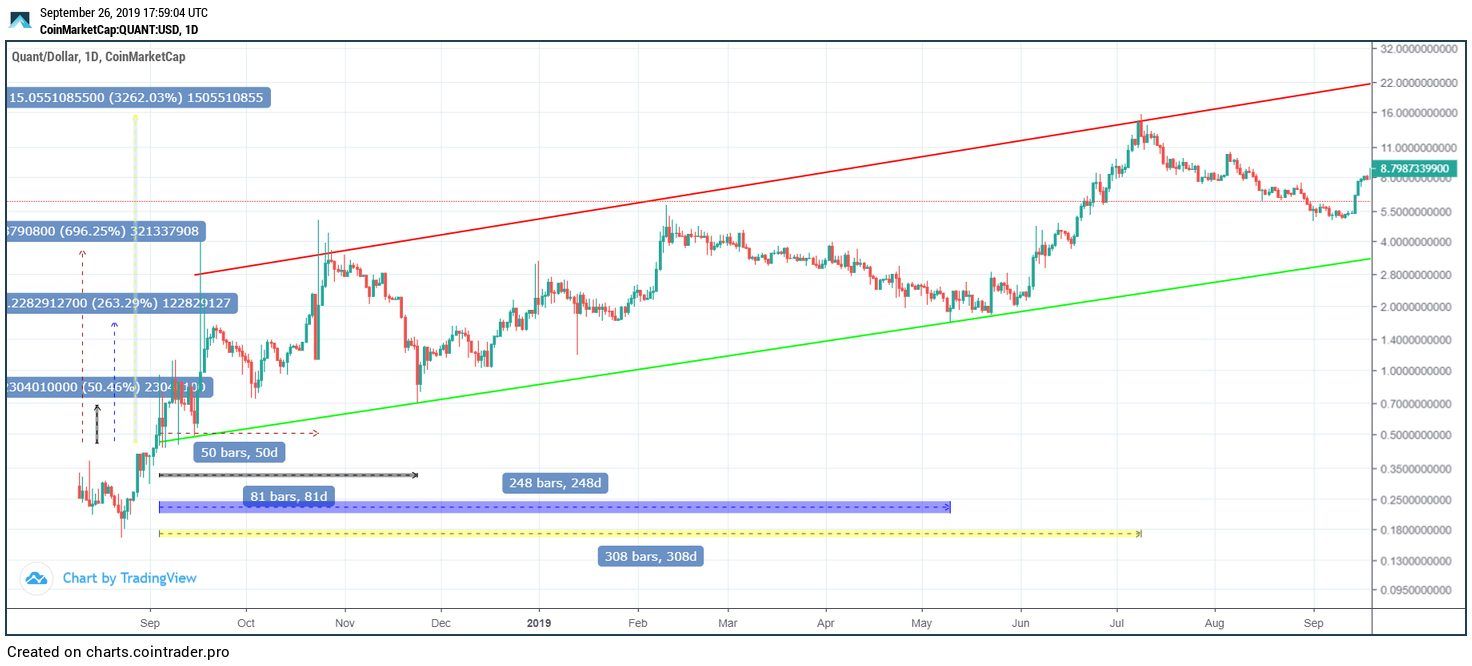 The first time QNT touched the support line was November 24, 2018. This occurred after 81 days and marked an increase of 52 percent. This amounts to an average increase of 0.64 percent.