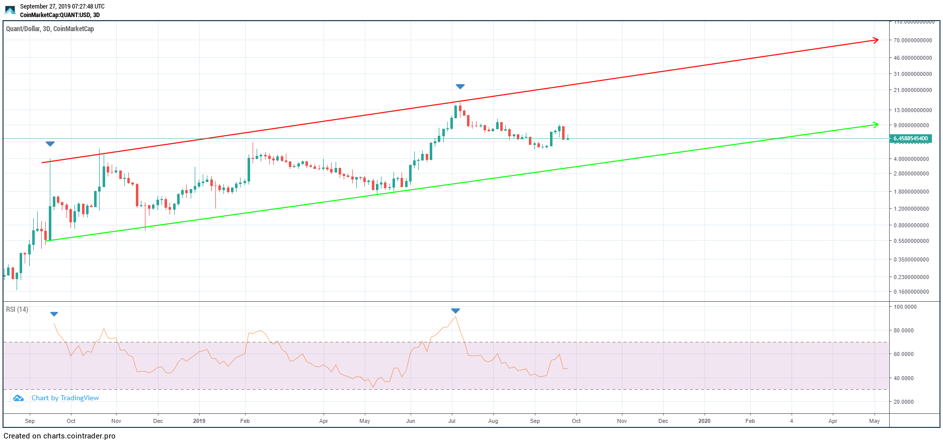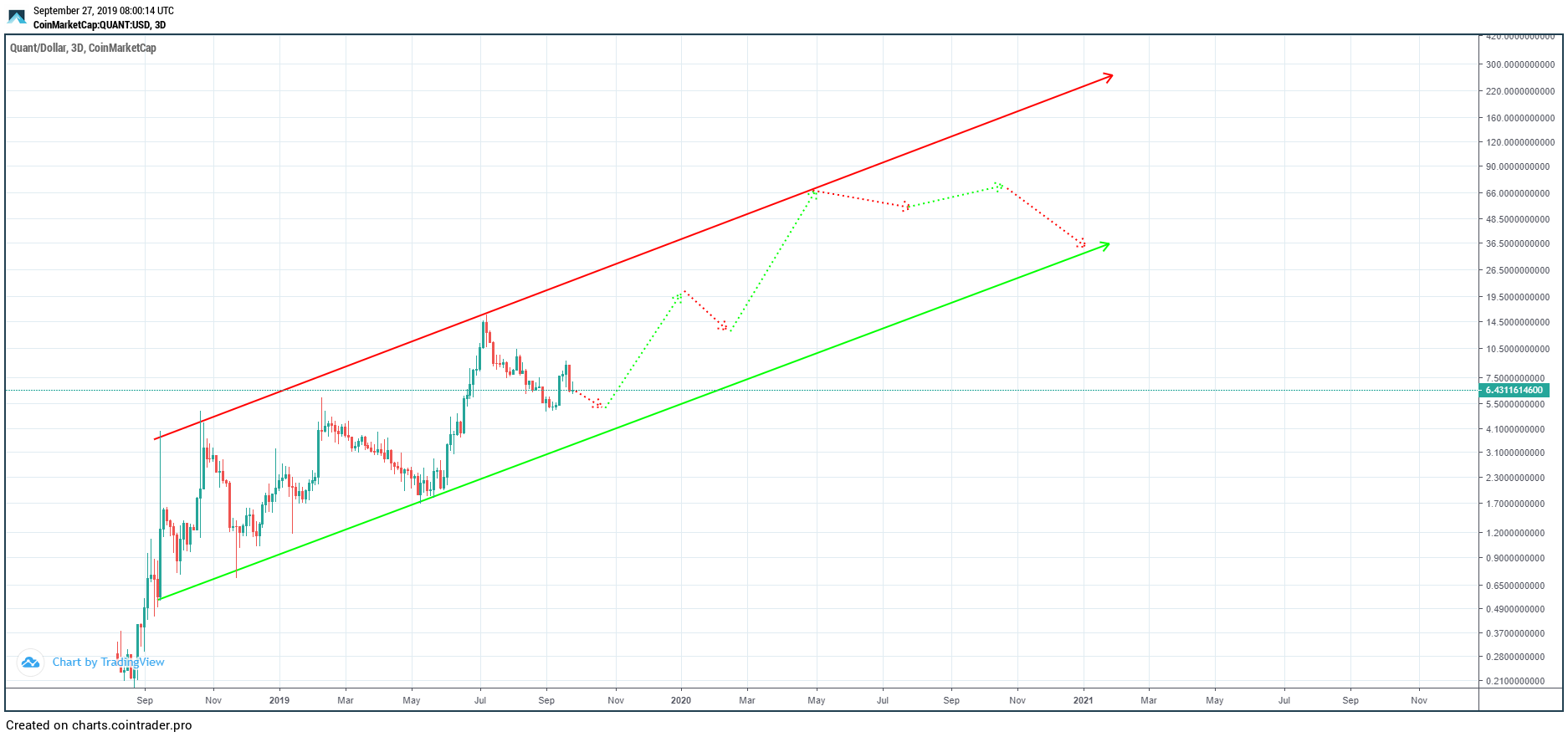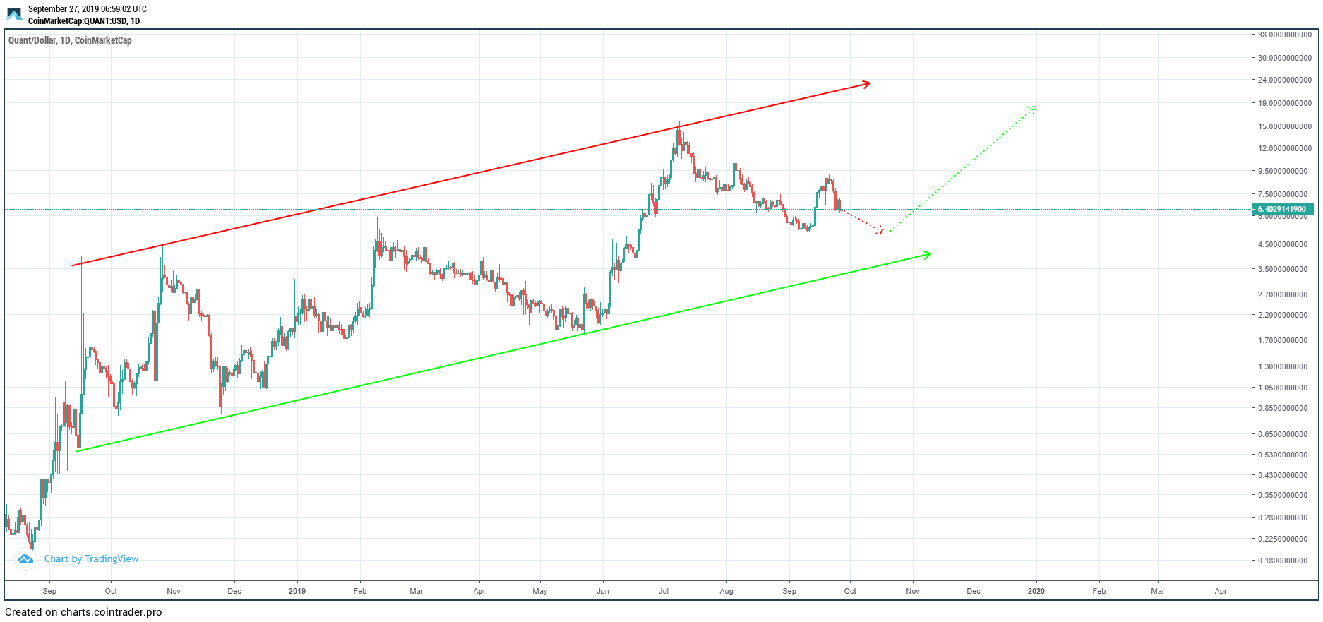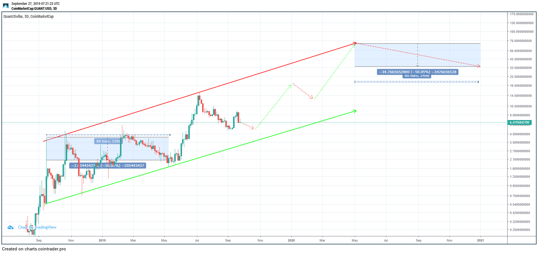 The first time QNT touched the support line was November 24, 2018. This occurred after 81 days and marked an increase of 52 percent. This amounts to an average increase of 0.64 percent.