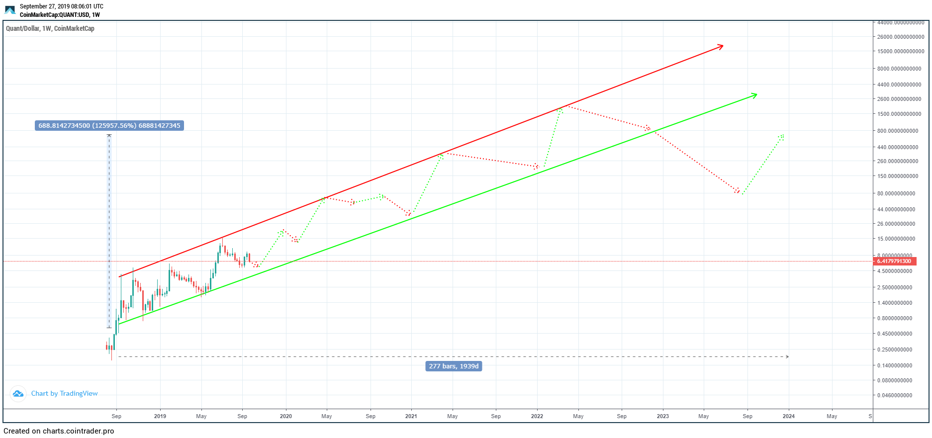 Additionally, using the logarithmic chart, we can see that almost the entire price movement of QNT (until now) can be contained inside an ascending channel. The resistance and support lines present good levels to sell and buy, respectively.