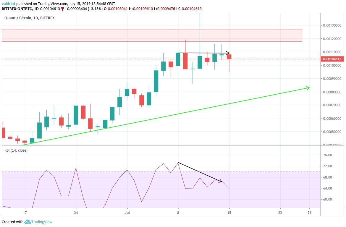 - QNT/BTC has been following an ascending support line.